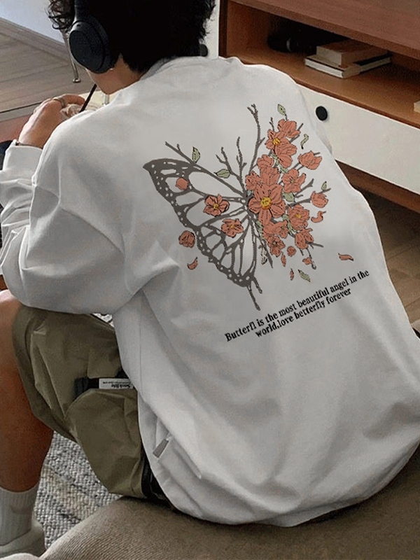 Herren-Langarm-T-Shirt mit Buchstaben- und Schmetterlingsdruck und Rundhalsausschnitt
