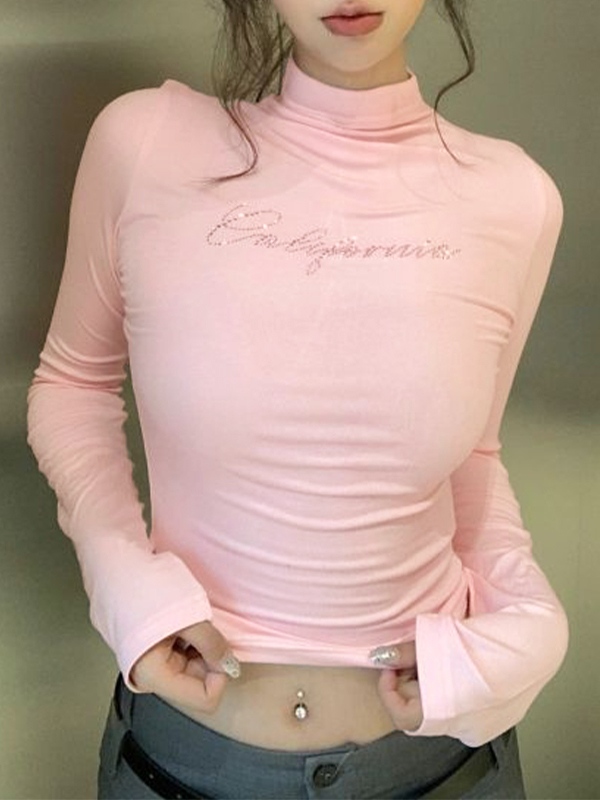 Langarm-T-Shirt mit Buchstaben-Strass-Print und Stehkragen