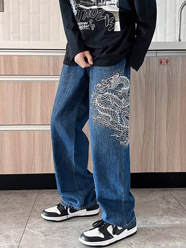 Herrenjeans mit geradem Bein und Drachenstickerei
