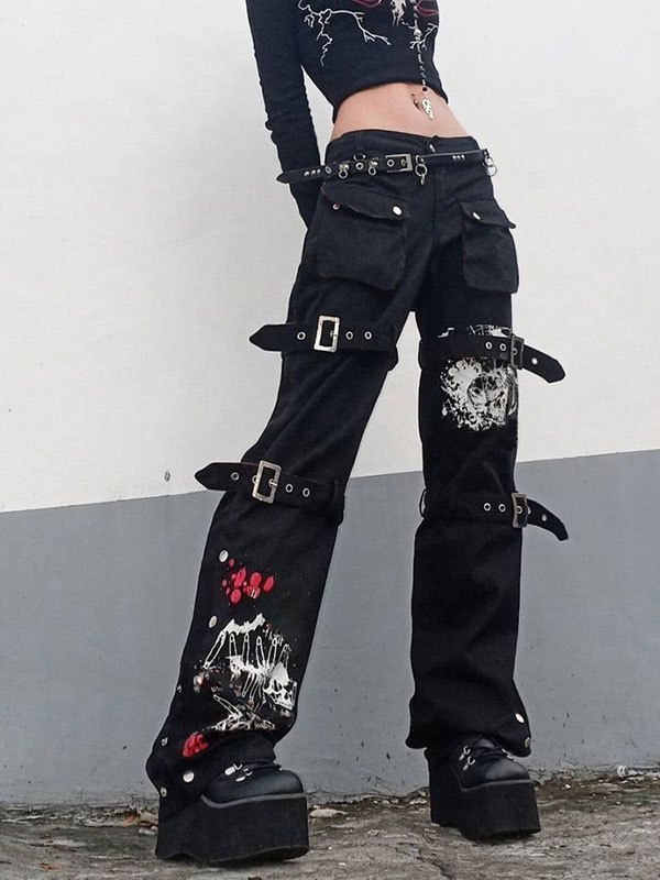 Stil: Casual, Street Farbe: Schwarz Hauptmaterial: Baumwolle, Polyester Passform: Regular Fit Design: Reißverschluss und Knopfverschluss, funktionelle Taschen, hohe Taille, mehrere Gürtelschlaufen, Schnallenriemen-Detail vorne