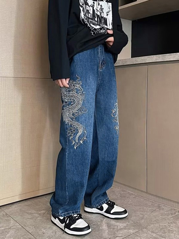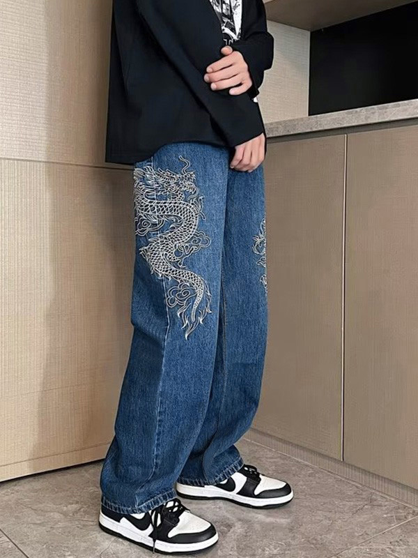 Design: Diese gewaschene Denim-Jeans passt zu schicken Street-Vibe-Outfits eine gerade Passform mit Drachenstickerei auf dem Bein, ein Reißverschluss und ein funktionales Taschendesign.