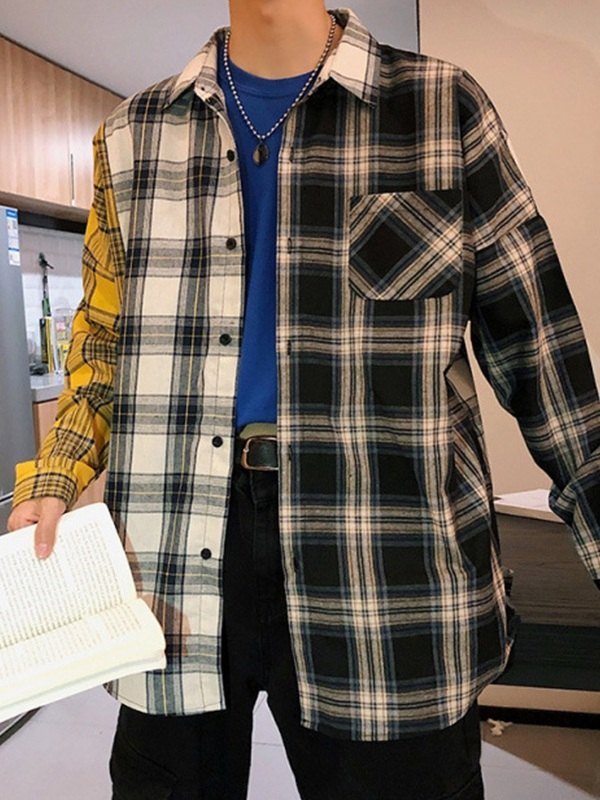 Beschreibung: Diese kuscheligen Herrenhemden im adretten Stil haben eine entspannte Silhouette, sind aus Baumwollmischgewebe gefertigt und verfügen über einen karierten Patchwork-Musterdruck, Vordertaschen und überschnittene Schultern sowie ein Knopfverschluss-Design.