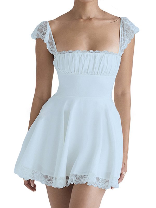 Beschreibung: Bereit für deine Reisestimmung mit diesen liebenswerten Kleidern. Es hat Flatterärmel aus Spitze, eine taillierte Taille mit verstellbarem Bindebandverschluss, ein gerafftes Brustdesign, einen Spitzeneinsatz am Saum und einen verdeckten Reißverschluss am Rücken.