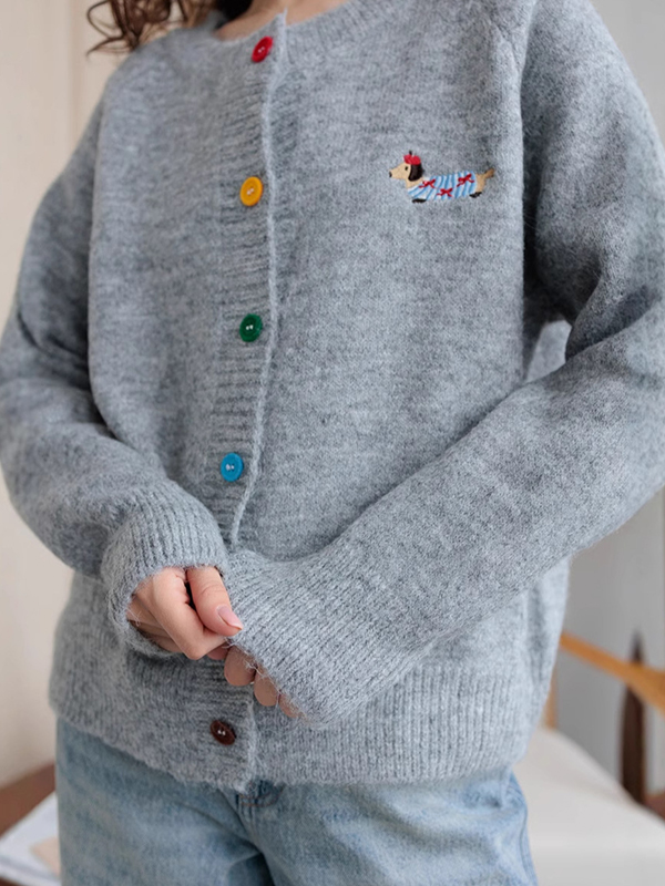 Strickjacke mit Rundhalsausschnitt, bunt, mit Knopf- und Welpenstickerei