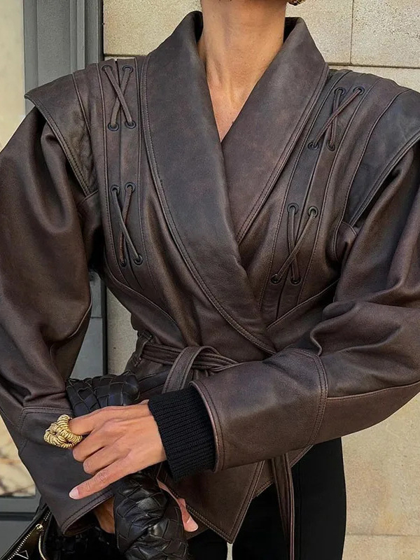 Langärmlige Lederjacke mit Revers und Schnürung