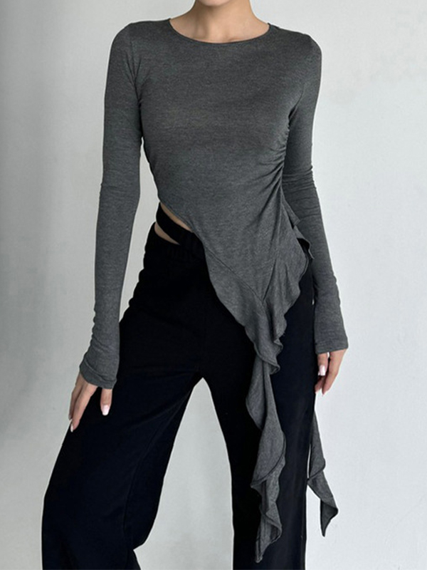 Einfarbiges, langärmliges T-Shirt mit Rüschen